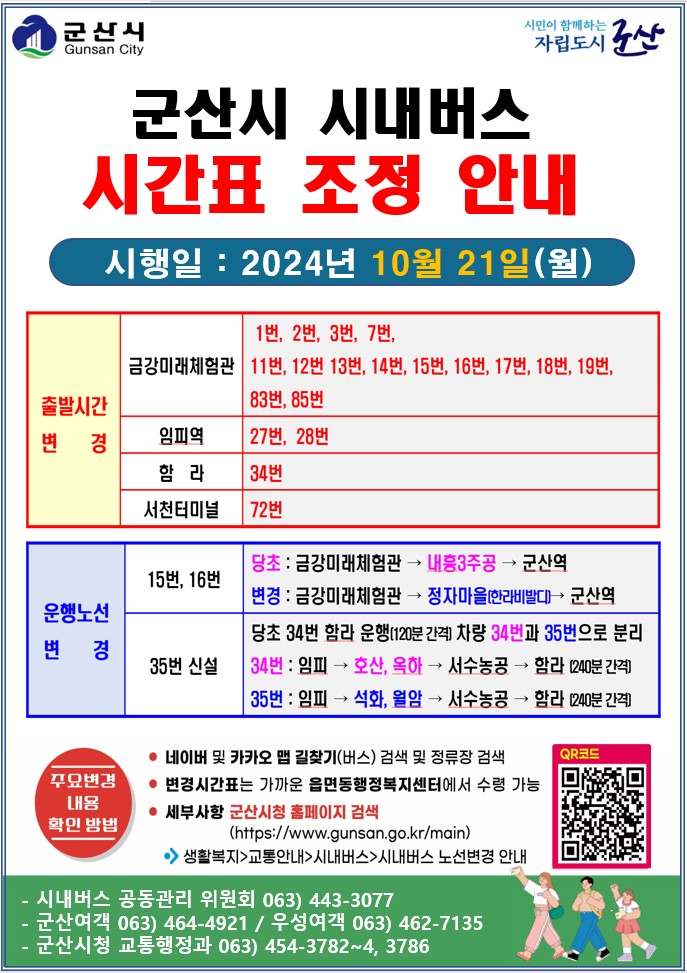 시내버스 노선(부분)변경 운영과 관련하여 최종 확정시간표를 10월 21일 첫차부터 시행할 예정이오니 붙임의 파일을 참고하시기 바랍니다.