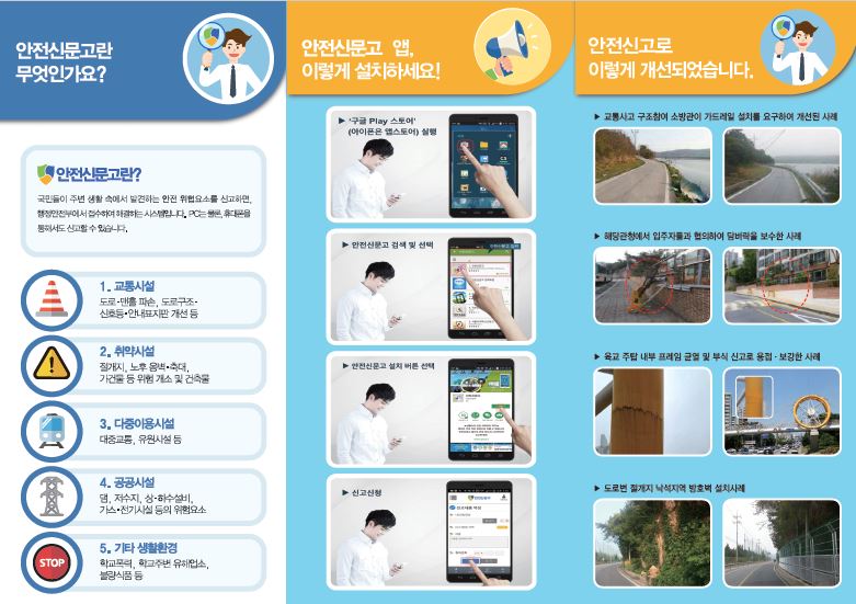 주민여러분께서는 첨부된 안전신문고 활용법을 참고하셔서 안전 위험요소를 사전에 신고하여 안전사고를 사전에 예방하시기 바랍니다.