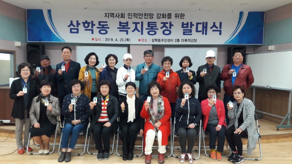 고독사 및 자살, 생활고 등이 지속적인 사회문제로 대두됨에 따라 삼학동이 지역 사정에 밝은 통장 20명에 대해 복지통장증을 교부하고 복지통장의 역할에 관한 교육을 실시하는 등 발대식을 하였고