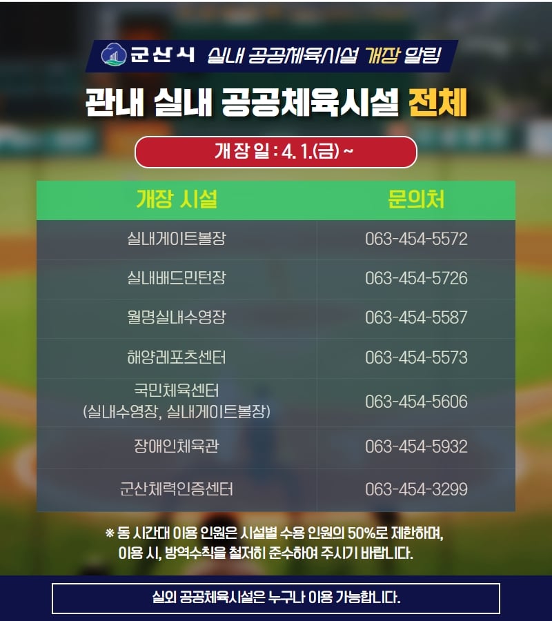 | 5617 | 군산시 실내 공공체육시설 개장 안내(4월1일부터) |