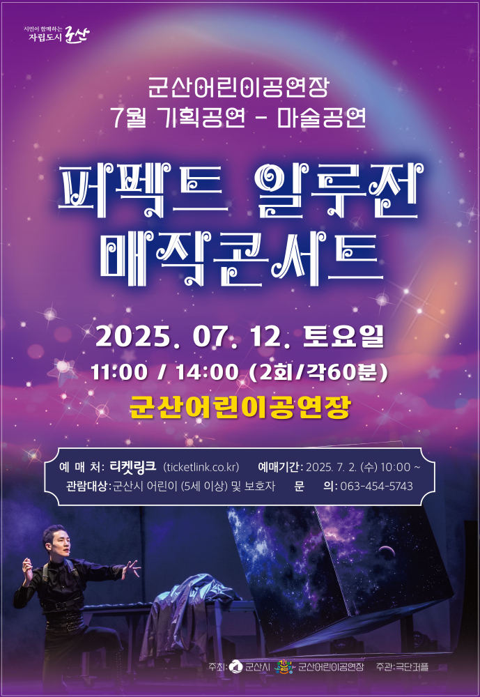 | 413 | 군산어린이공연장 7월 기획공연 '퍼펙트 일루전 매직콘서트' 안내 |