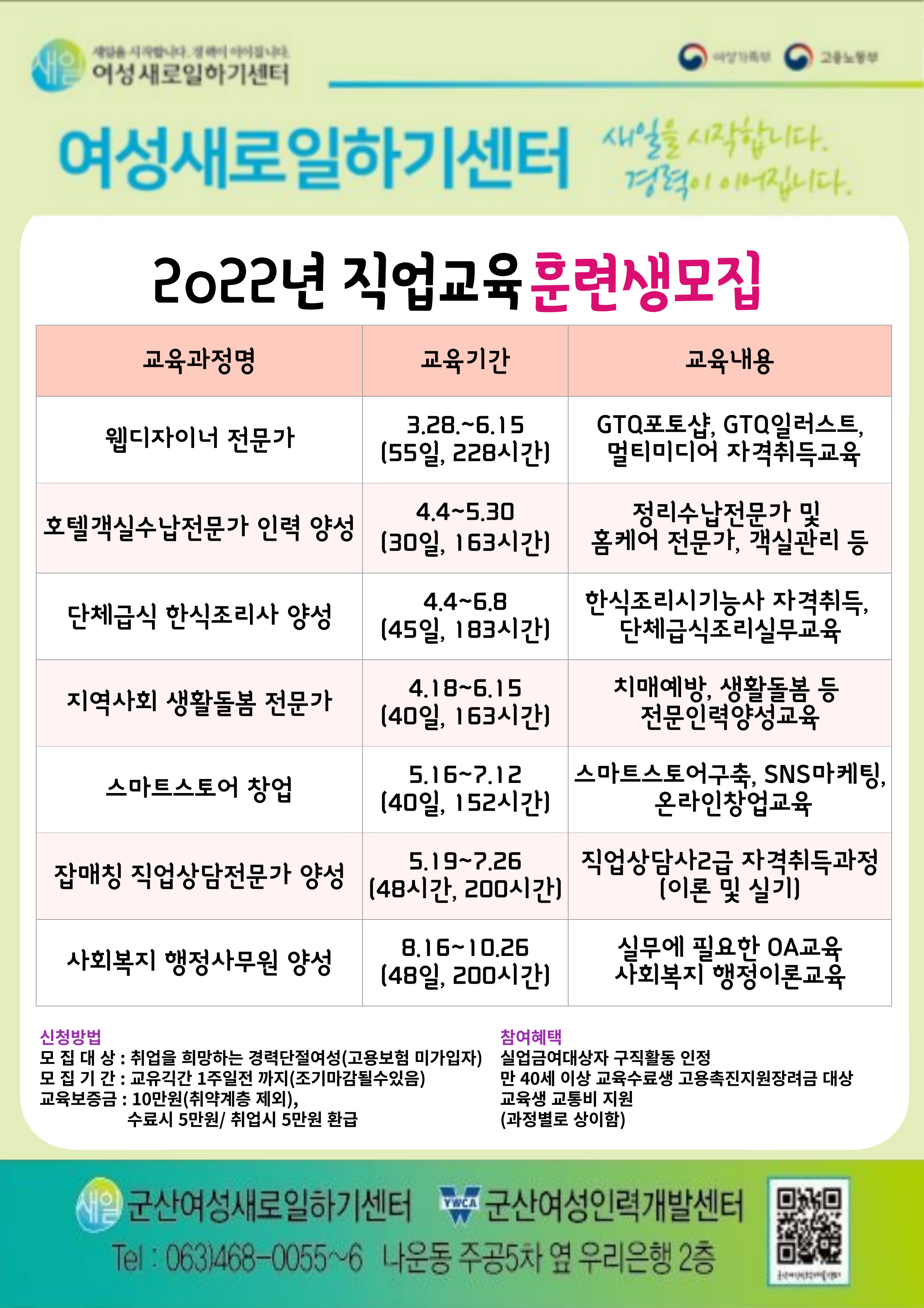 | 144 | 군산여성인력개발센터 2022년 경력단절여성 직업교육 훈련생 모집 |