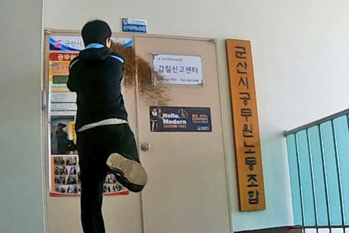 오늘 오전 군산시 공무원 노조 사무실 개사료를 뿌렸습니다.