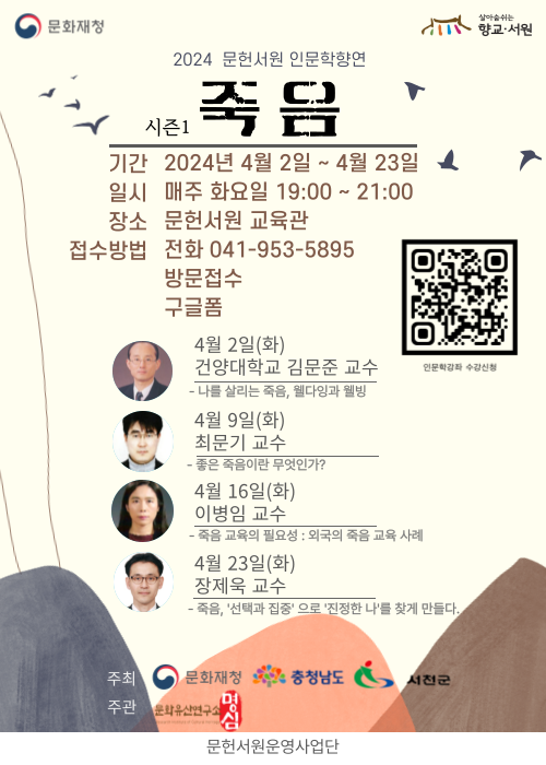안녕하세요. 2024년 4월 2일부터 서천 문헌서원에서 인문학향연 강좌가 시작됩니다. 아래와 같이 수강자를 모집하오니 참여를 희망하는 여러분의 많은 관심과 참여 부탁드립니다.