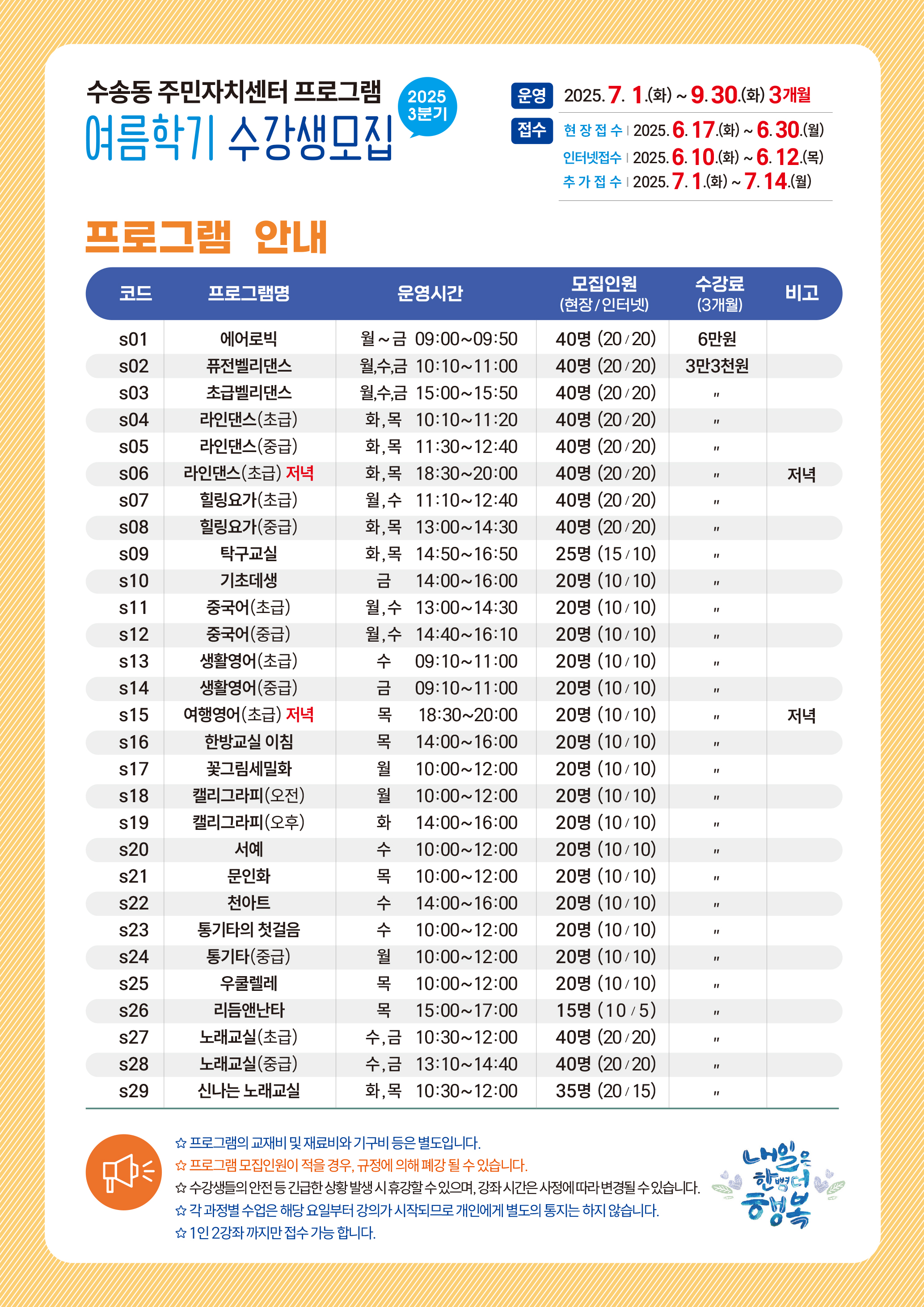 | 21 | 2024년 3분기 수송동 주민자치센터 프로그램 수강생 모집 |