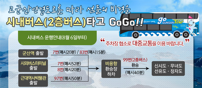 근대역사박물관 97번 → 비응항 환승장 99번(2층버스) 환승 → 새만금광장 → 신시도 →무녀도→선유도→ 장자도