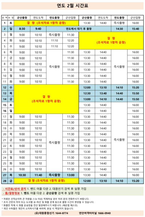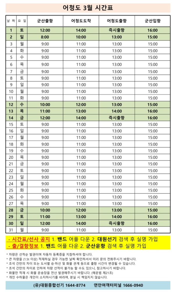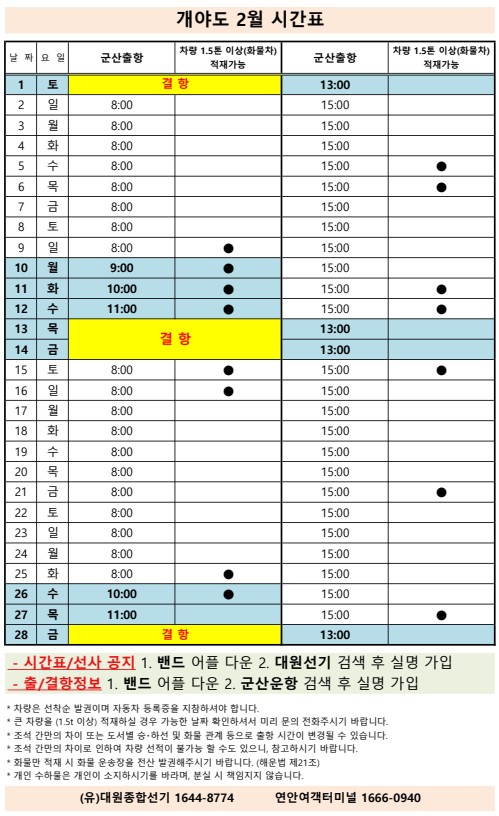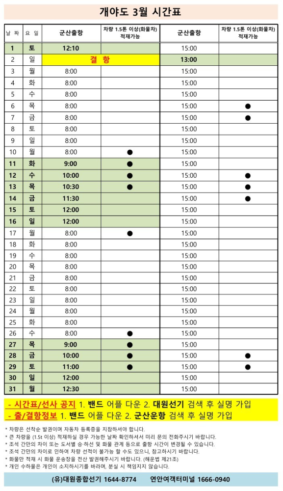 여객선 안내 -군산 연안여객터미널 (유) 대원종합선기 1644-8774 (임해로 378-8)(어청도 개야도 연도)