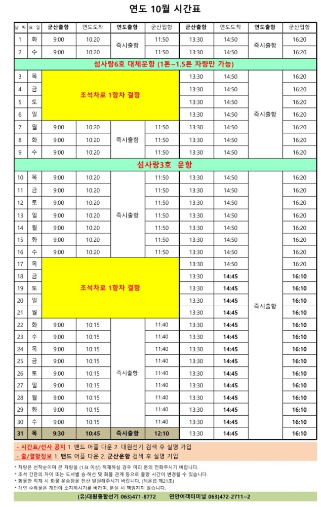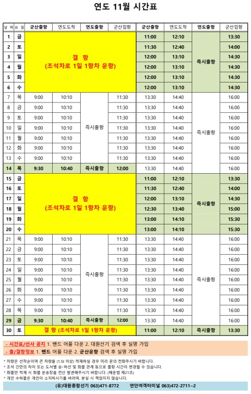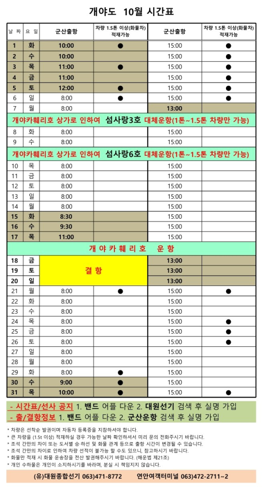 고군산 군도 섬여행 선박 운행 시간표 안내입니다.
