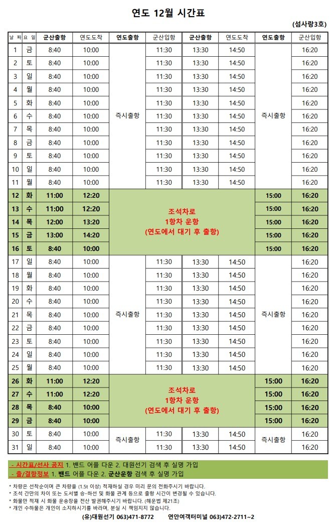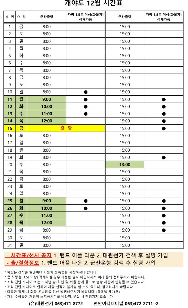 여객선 안내 -군산 연안여객터미널 (유) 대원종합선기 1644-8774 (임해로 378-8)(어청도 개야도 연도)