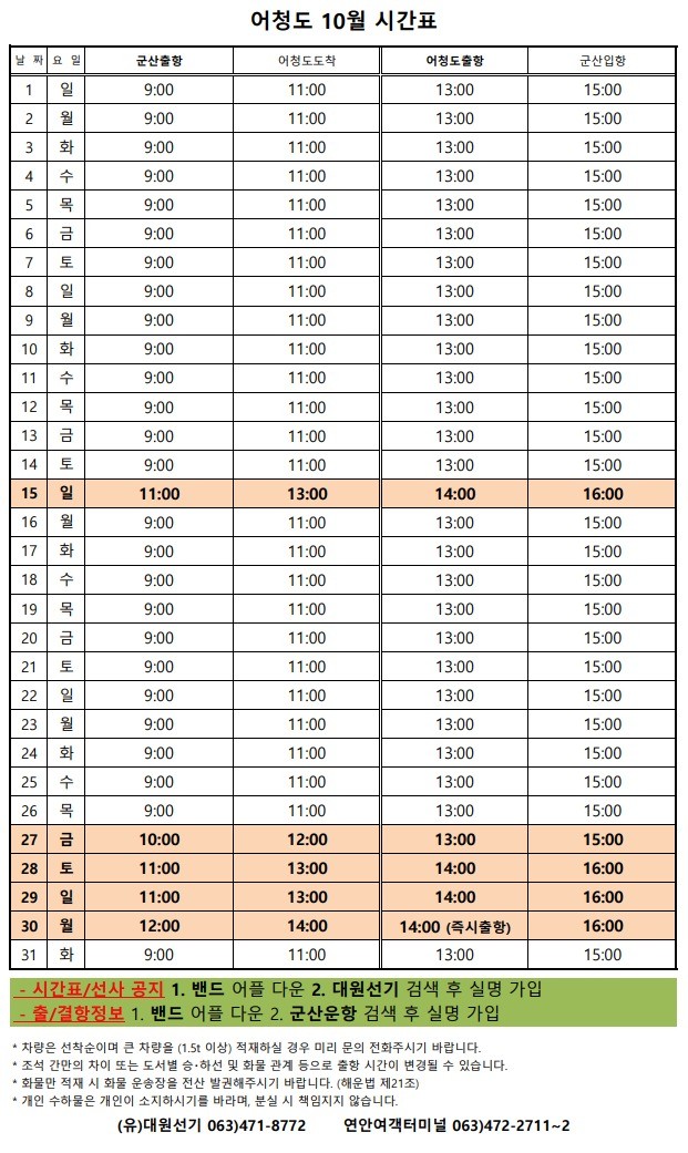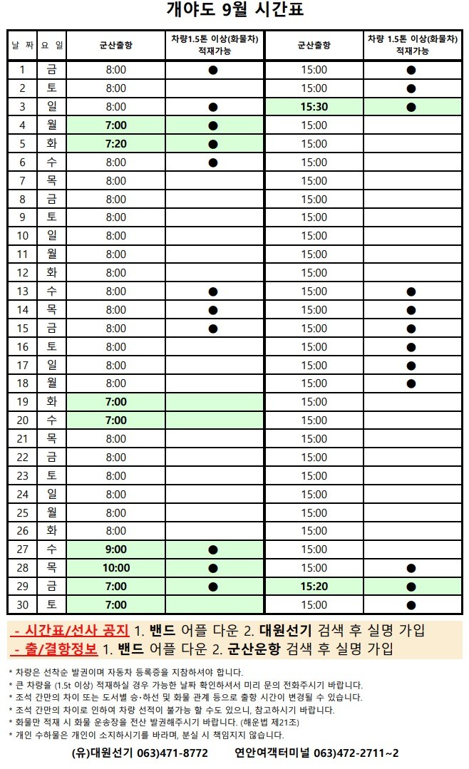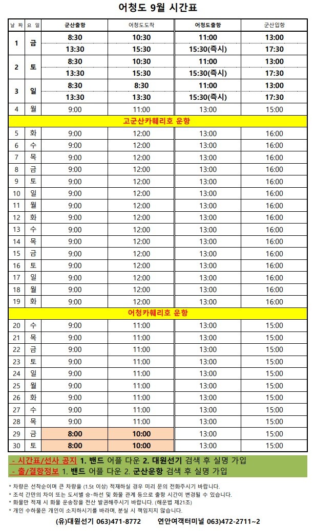 고군산 군도 섬여행 선박 운행 시간표 안내입니다.