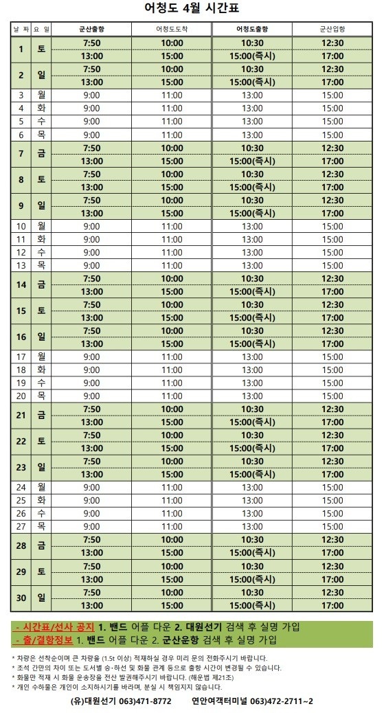 고군산 군도 섬여행 선박 운행 시간표 안내입니다.