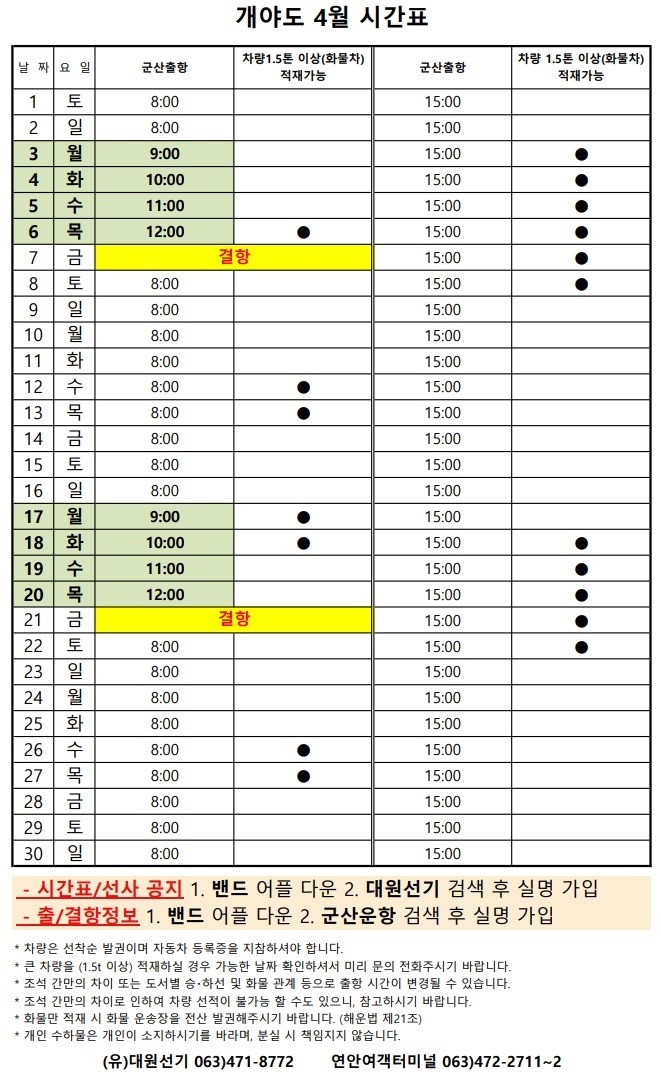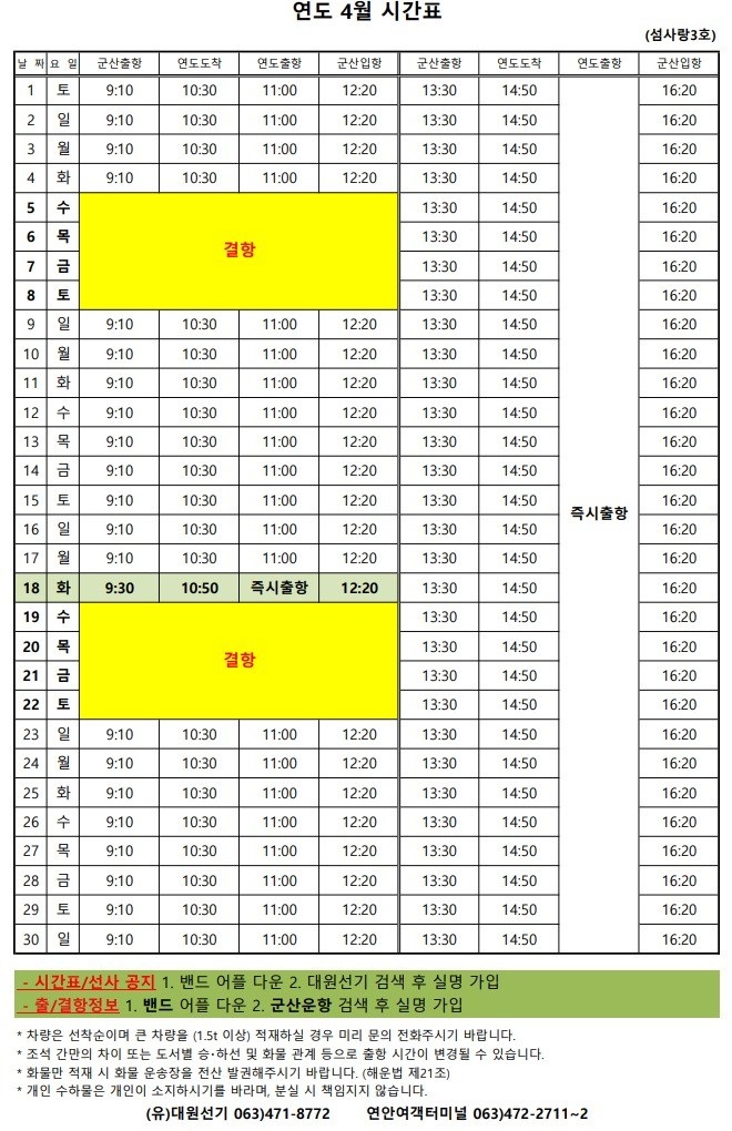 여객선 안내 -군산 연안여객터미널 (유) 대원종합선기 1644-8774 (임해로 378-8)(어청도 개야도 연도)