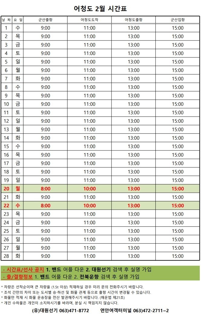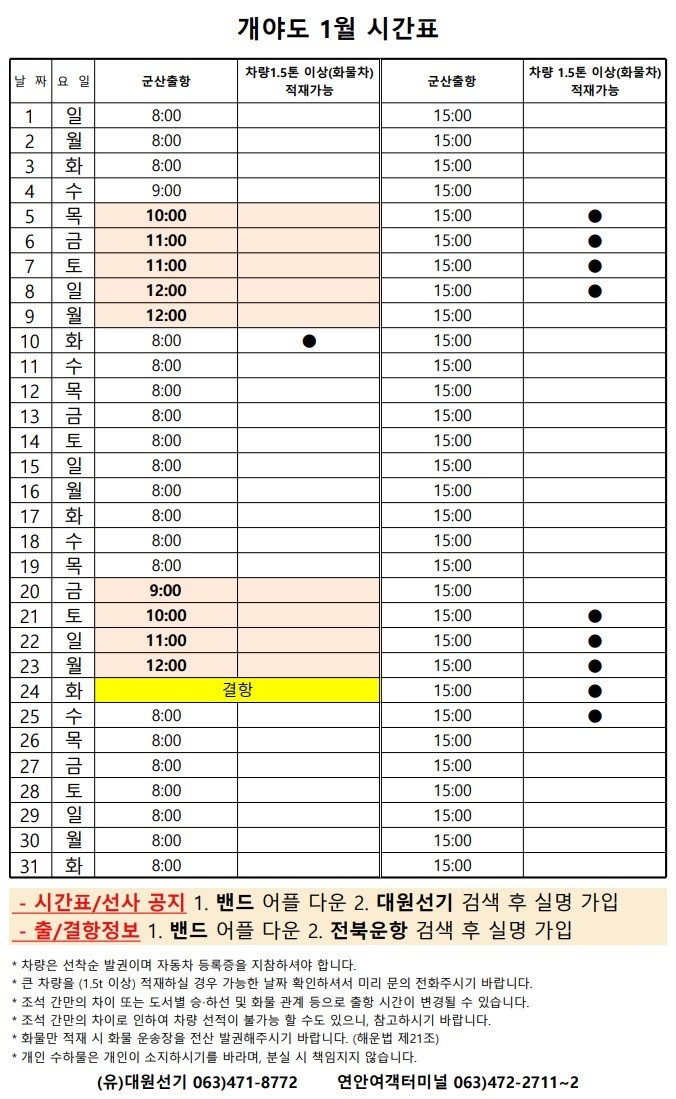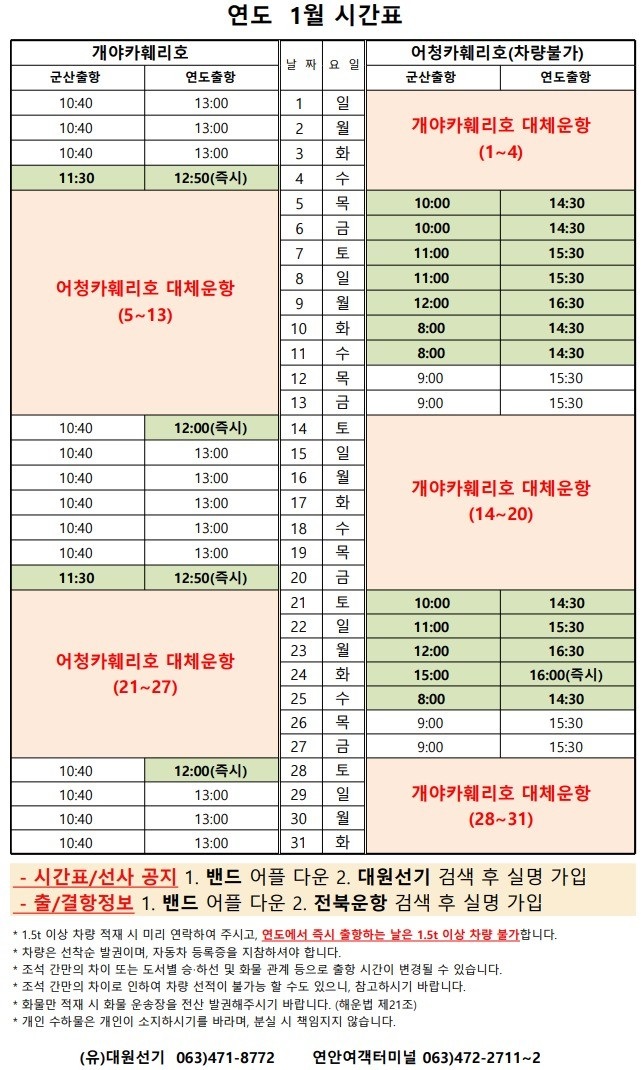 여객선 안내 -군산 연안여객터미널 (유) 대원종합선기 1644-8774 (임해로 378-8)(어청도 개야도 연도)