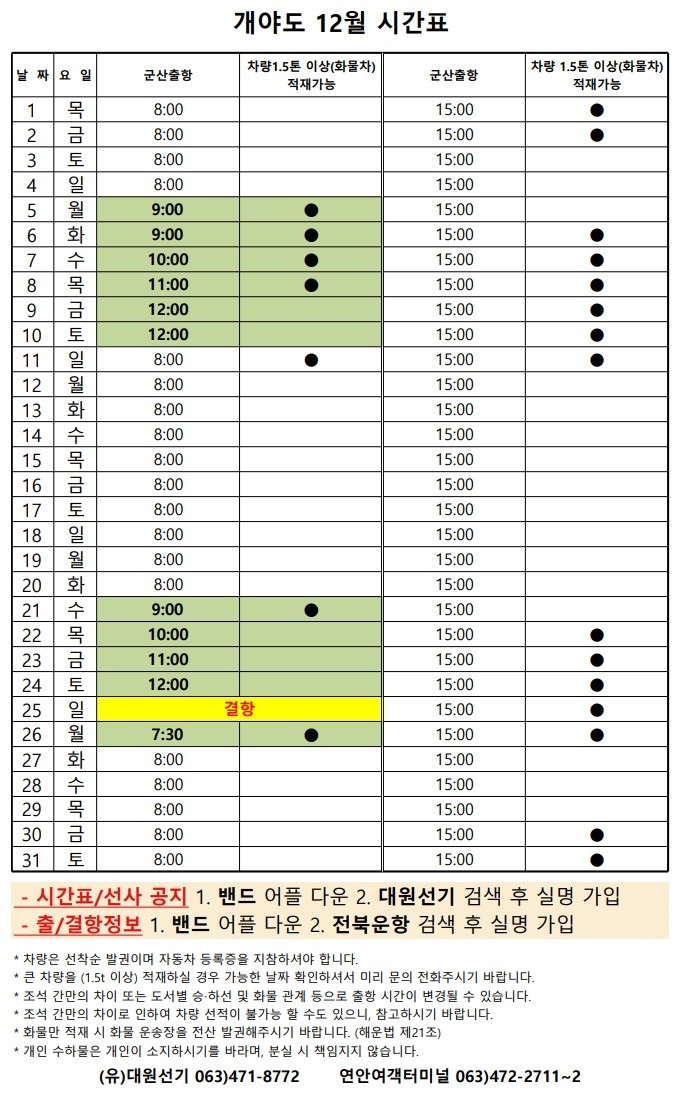 여객선 안내 -군산 연안여객터미널 (유) 대원종합선기 1644-8774 (임해로 378-8)(어청도 개야도 연도)