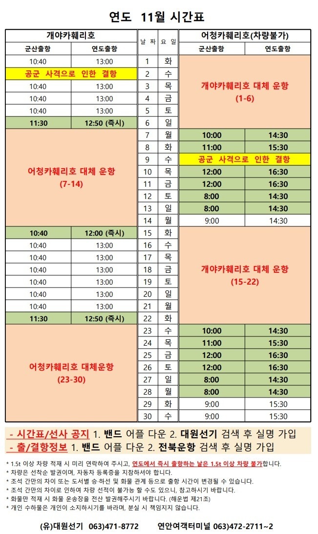 여객선 안내 -군산 연안여객터미널 (유) 대원종합선기 1644-8774 (임해로 378-8)(어청도 개야도 연도)