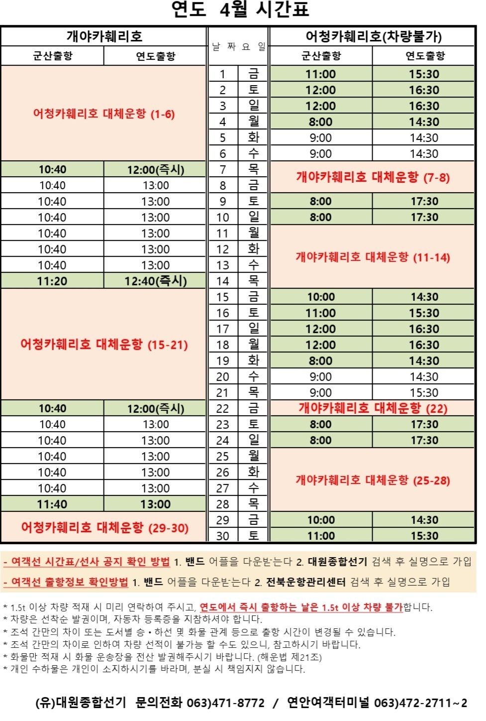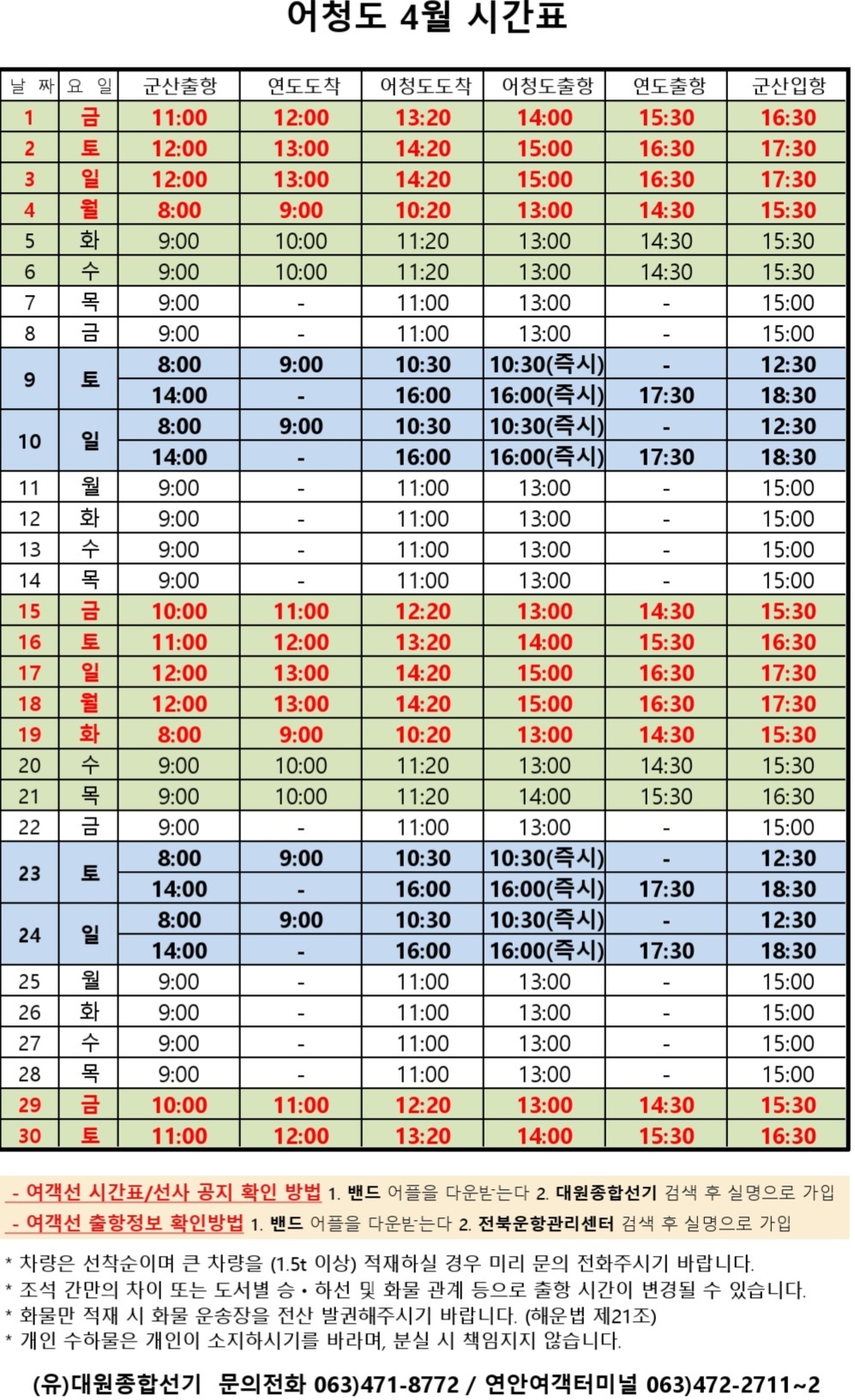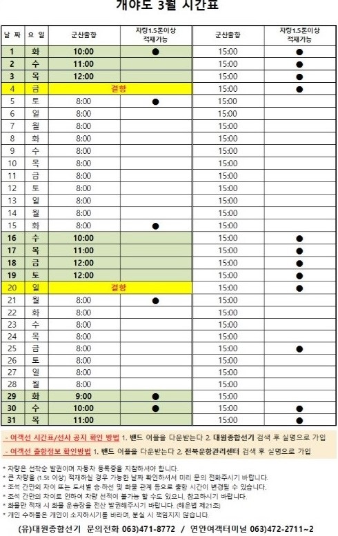 여객선 안내 -군산 연안여객터미널 (유) 대원종합선기 1644-8774 (임해로 378-8)(어청도 개야도 연도)
