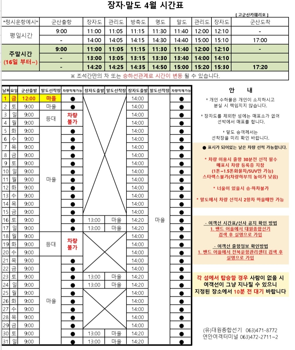 고군산 군도 섬여행 선박 운행 시간표 안내입니다.
