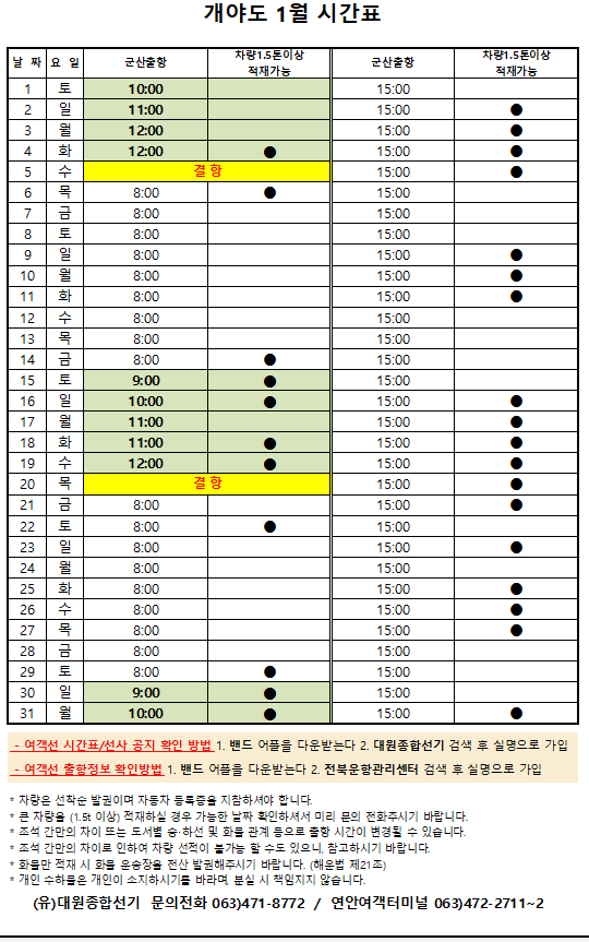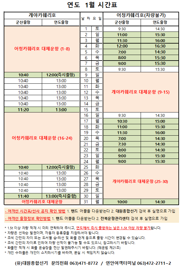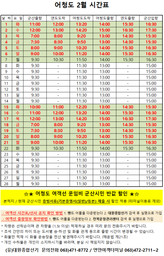 여객선 안내 -군산 연안여객터미널 (유) 대원종합선기 1644-8774 (임해로 378-8)(어청도 개야도 연도)