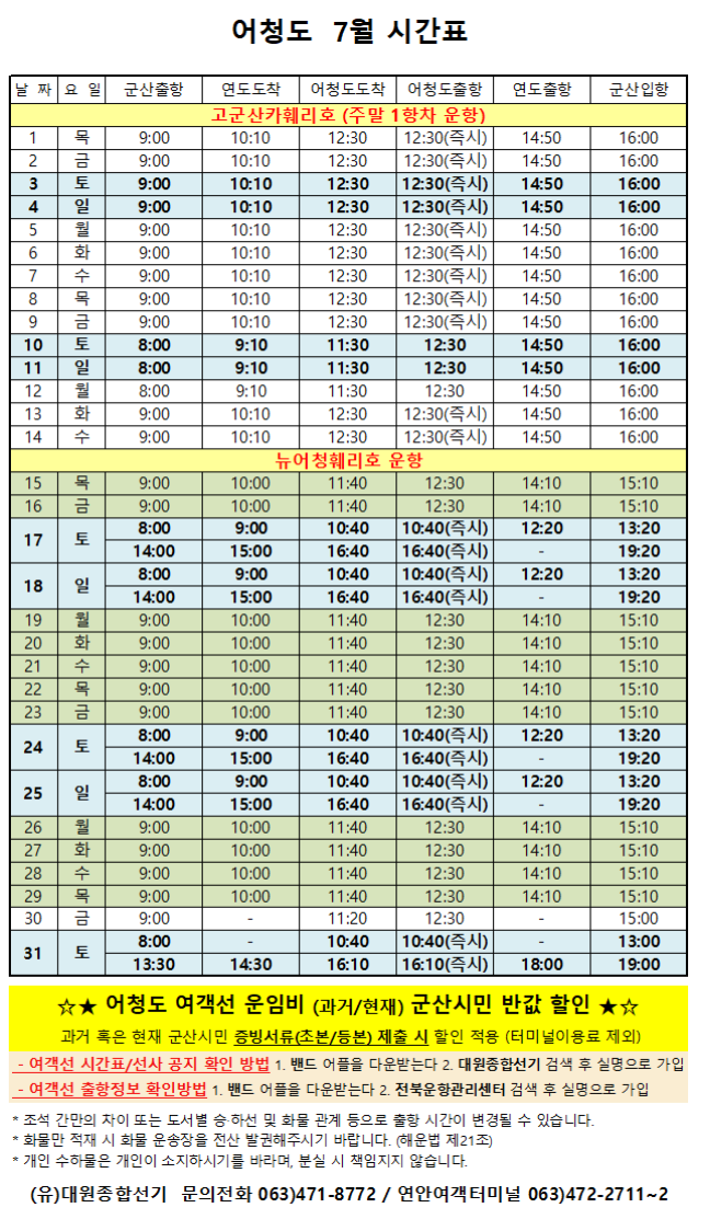 여객선 안내 -군산 연안여객터미널 (유) 대원종합선기 1644-8774 (임해로 378-8)(어청도 개야도 연도)