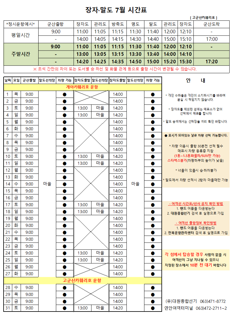 문화관광국 관광진흥과 에서 제작한 여객선 시간표 저작물은 "공공누리" 출처표시-상업적 이용금지-변경금지 조건에 따라 이용 할 수 있습니다.