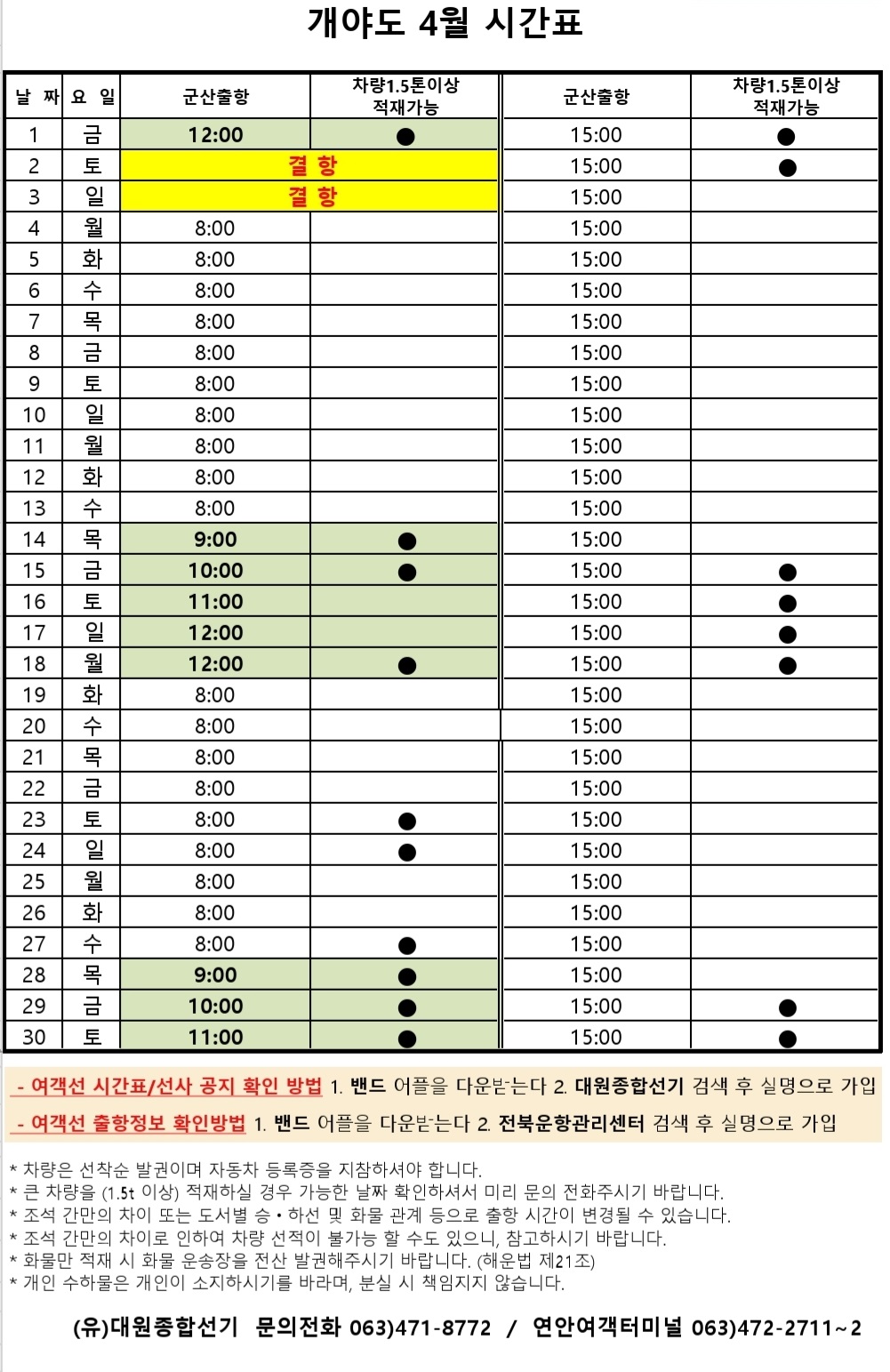개야도 4월 여객시간표