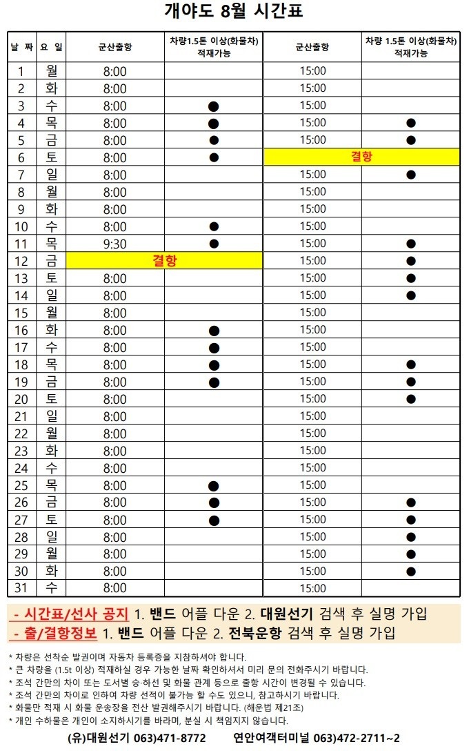 8월 개야도 여객시간표 알림