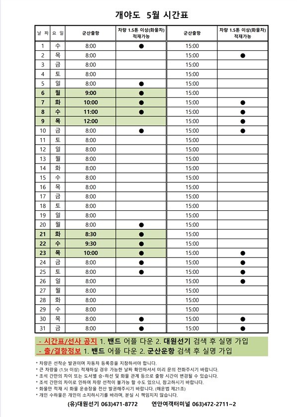 개야도 5월 여객시간표 알림